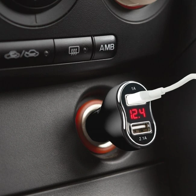 Adaptér do autozapalovača s dvojitým USB portom es meraním napätie.Skrytý LED displej medzi dvomi USB portmi zobrazuje červenou farbou aktuálne napätie a silu prúdu.Chrómový okraj dodáva elegantný vzhľad, vďaka čomu vyzerá dobre v interiéri vozidla.Dvojitý USB port umožňuje súbežné nabíjanie dvoch zariadení.