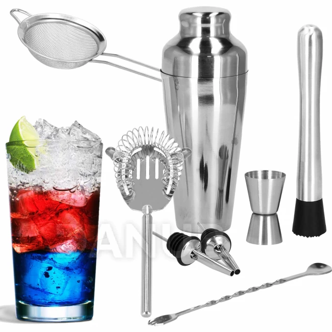 Barmanská súprava na nápoje - 8 prvkov - shaker 550 ml - strieborná