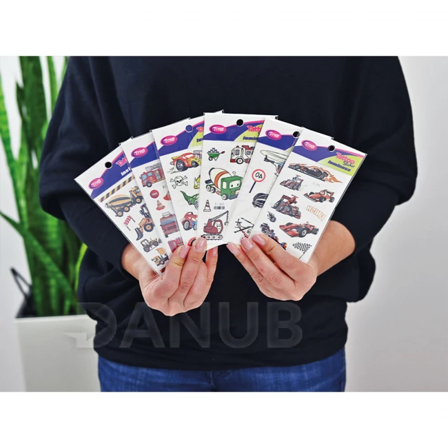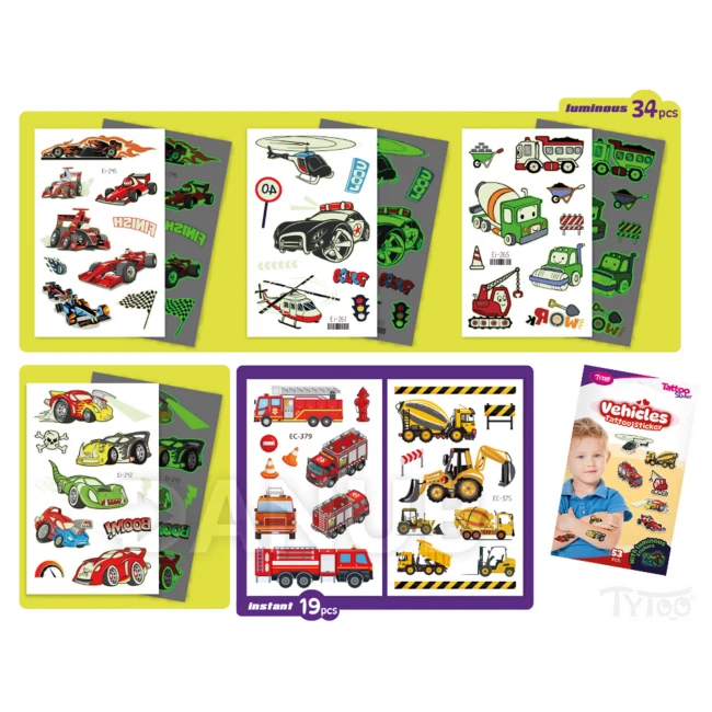 Všetko čo sú autá! Ľahko nanášateľné, jednoduché a pekné tetovania so vzormi áut v jednej sade.Tieto dočasné tetovačné nálepky majú výbornú kvalitu, zachovajú si tak svoju živú farbu a bohatosť detailov dlhší čas, dokonca aj niekoľko dní.Ľahko sa nanášajú a odstraňujú bez podráždenia alebo poškodenia pokožky.53 ks nálepok so vzorom áut na 6 listoch:športové autá, svietiace autá,pracovné stroje, hasiace a policajné autá.