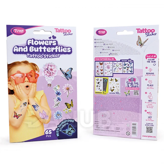 Ľahko nanášateľné, jednoduché a pekné tetovania so vzorom kveto a motýľov .Tieto dočasné tetovačné nálepky majú výbornú kvalitu, zachovajú si tak svoju živú farbu a bohatosť detailov dlhší čas, dokonca aj niekoľko dní.Ľahko sa nanášajú a odstraňujú bez podráždenia alebo poškodenia pokožky.65 ks nálepok so vzorom kvetov a motýľov na 6 listoch, mnoho motýľov, kvetov, svietiace a rôznofarebné, naviac aj balón s kvetmi.