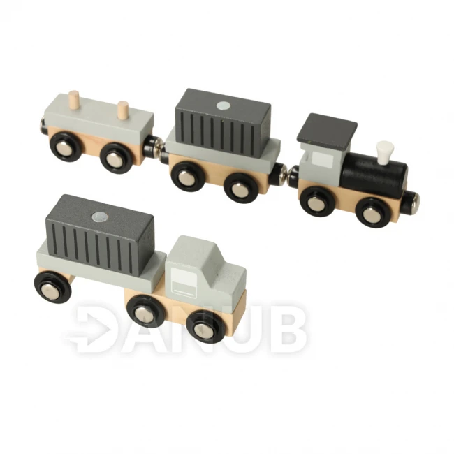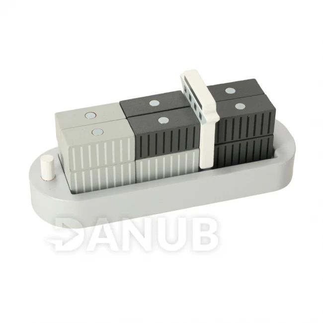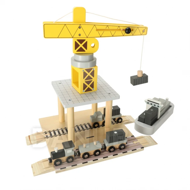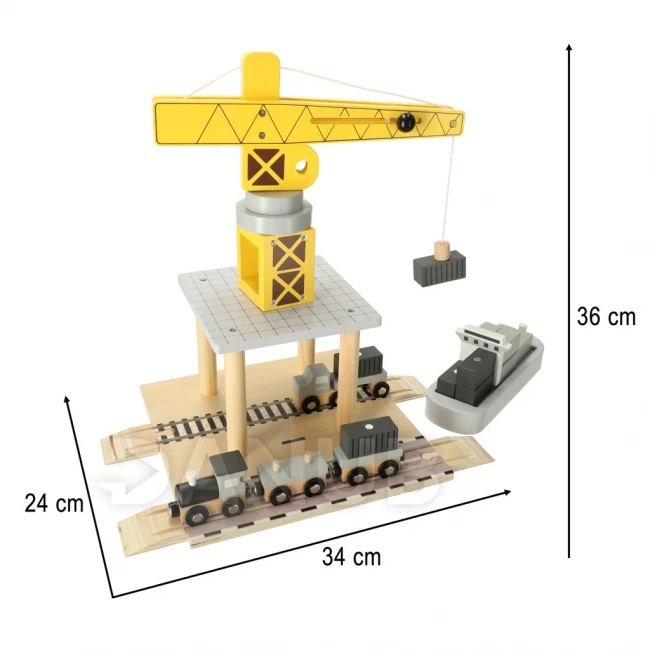 Loď plná kontajnerov na obzore! Drevený námorný prístav so žeriavom je hračka, ktorá deťom umožní vstúpiť do sveta logistiky. Sada obsahuje všetko, čo potrebujete na vytvorenie vlastného mini prístavu : žeriav, loď, vlak a kontajnery (12). Vďaka lanu (86 centimetrov) a magnetom žeriav zdvihne každý kontajner a bezpečne ho prepraví z paluby lode do vozňov vlaku.