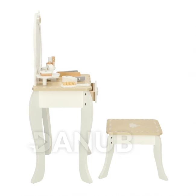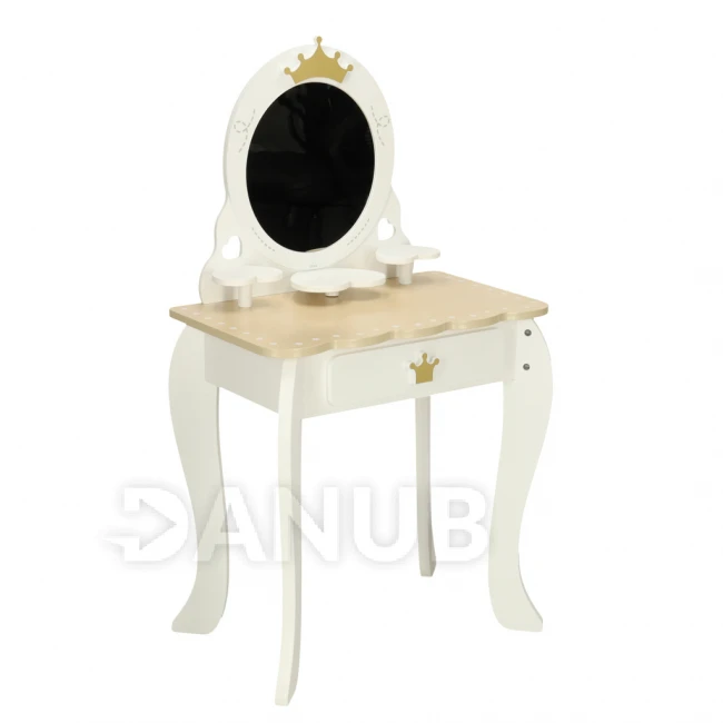 Toaletný stolík je vyrobený z kvalitného dreva, vďaka čomu je pevný a bezpečný pre deti.