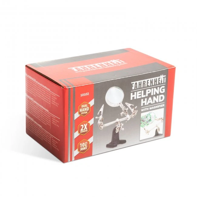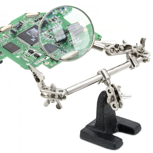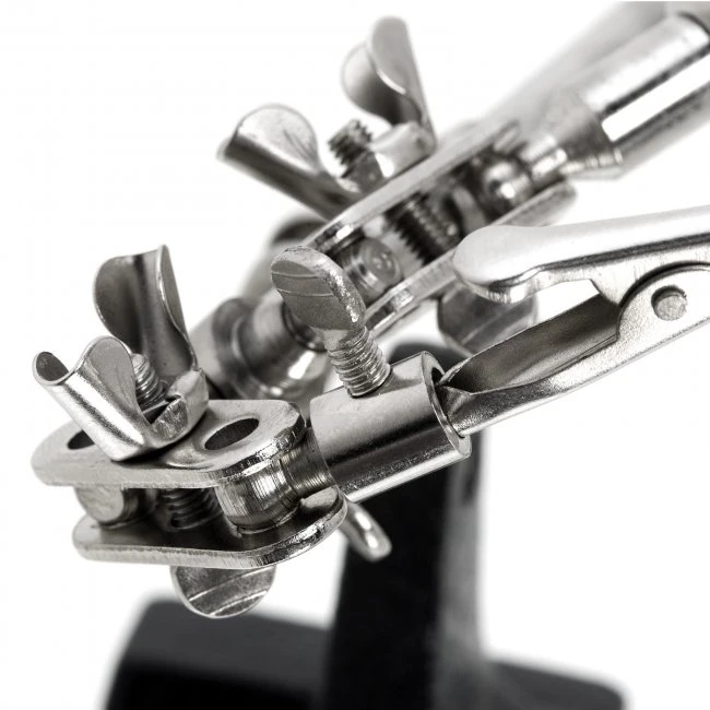 Veľmi dobre využiteľný v spájkovacej technike, elektrotechnike, modelárstve, a pre domáce použitie. Drobné diely sa dajú veľmi ľahko uchytiť do svoriek, a pritom obidve ruky máte voľné. Všetky svorky sú otočné o 360° a zafixovateľné. Liatinový kovový podstavec zabezpečuje masívny základ, silné krokosvorky zabezpečujú stabilitu uchyteného dielu, na ktorom môžete vykonať aj tie najpresnejšie práce s pomocou lupy, so sklenenou šošovkou s 2x zväčšením, bez zkreslenia.