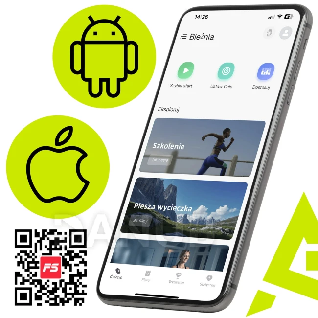 - Bežecký pás je dodávaný so špeciálnou mobilnou aplikáciou FitShow, ktorá vám umožňuje vybrať si vopred pripravené tréningové plány a sledovať váš pokrok. Aplikácia vám tiež umožňuje ovládať bežecký pás priamo zo smartfónu.