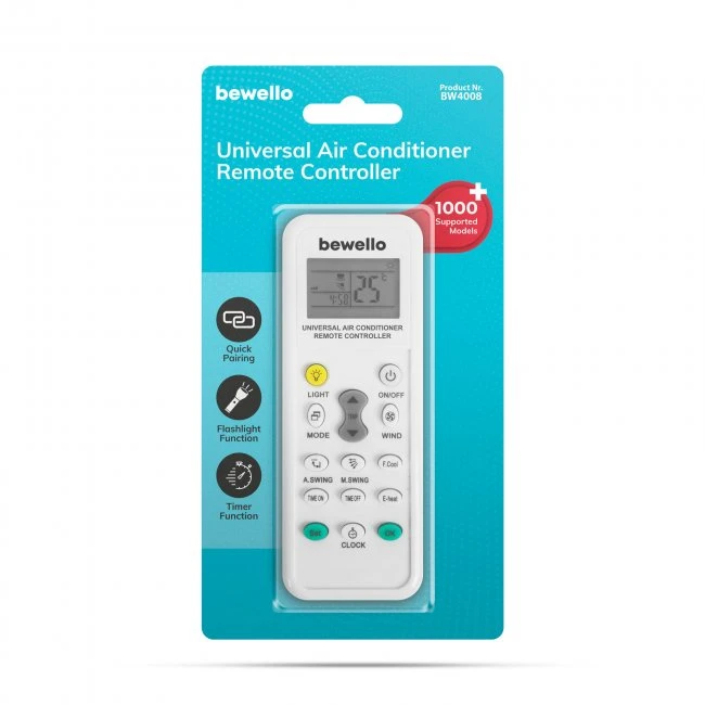 Univerzálny diaľkový ovládač, ktorý je vhodný k takmer všetkým klimatizačným zariadeniam.Výborné riešenie ak Vám originálny diaľkový ovládač zmizol, poškodil alebo nefunguje s viacerými typmi klimatizácií.Nie je potrebné tlačidlá jednotlivo naučiť, stačí ako ovládač nastavíte na požadovaný výrobný kód podľa popisu.