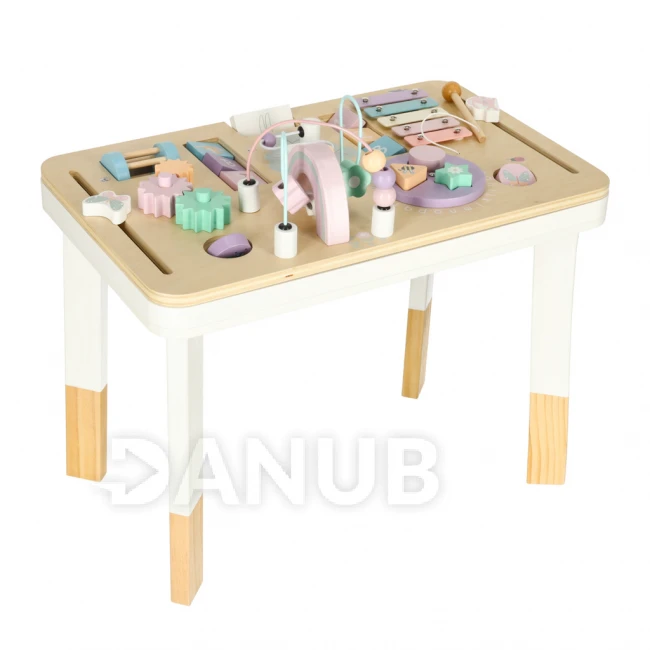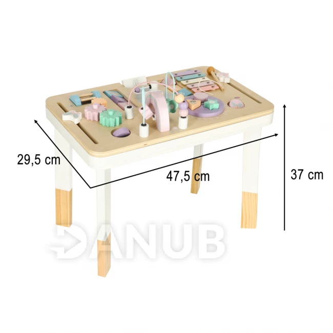 Interaktívny stôl LULILO – vytvorený s ohľadom na tých najmenších! Vďaka rôznym manipulačným prvkom , ako sú posúvače, pohyblivé kocky, ozubené kolesá, triedička s tromi tvarmi, činely s palicou a bludiská s farebnými korálkami, budú batoľatá spoznávať svet hrou. Vrchná doska stola (47,5 x 29,5 cm) sa dá odstrániť, čím sa stôl premení na miesto, kde si deti môžu kresliť alebo sa hrať s kinetickým pieskom. Stolík sa vďaka svojej výške 37 centimetrov dokonale prispôsobí potrebám tých najmenších.
