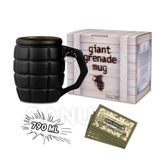 Čierny hrnček v tvare granátu ideálny na čaj, alebo veľkú kávu. Balenie obsahuje aj sadu kartičiek, ktoré je možné pripnú na poistku granátu.