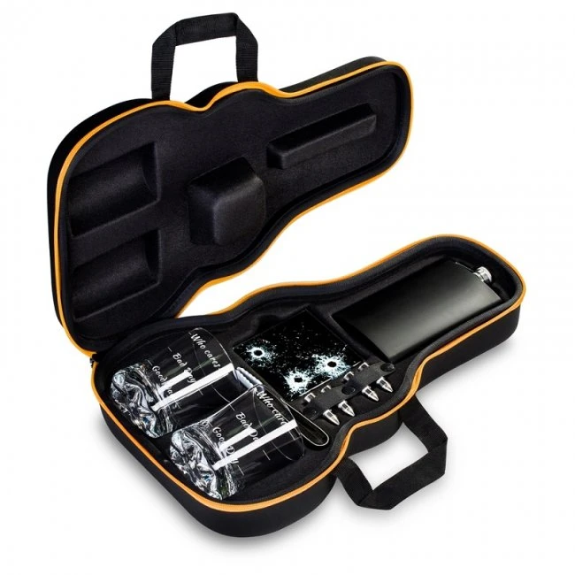 - súprava sa skladá z čiernej matnej ploskačky (300 ml), 2 pohárikov whisky (2 x 250 ml), 2 sklenených tácok, 4 kovových nábojov na ľad, klieští na ľad, gitarové puzdro