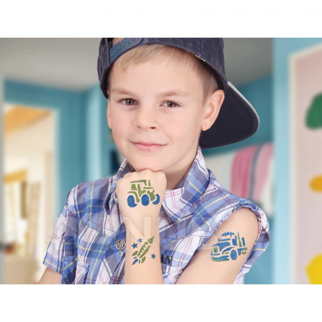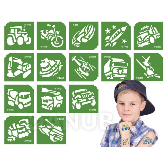 Sada šablón obsahuje 15 šablón s vozidlami, ktoré môžete použiť na trblietavé tetovanie alebo iné maľovanie na telo.V jednom balení získate hitové vzory ako mačiatka, medvedíky, psíky, slimáky či dráčiky, ktoré deti určite potešia.