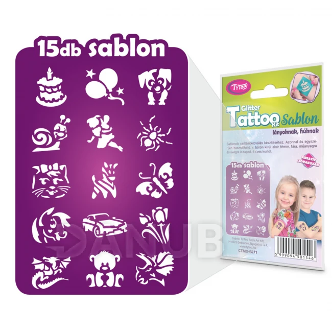 Sada šablón obsahuje 15 narodeninových šablón pre deti, ktoré môžete použiť na trblietavé tetovanie alebo iné maľovanie na telo.V jednom balení získate dizajny hitov, ako sú mačiatka, medvedíky, psíky, slimáky či dráčiky, ktoré deti určite potešia.