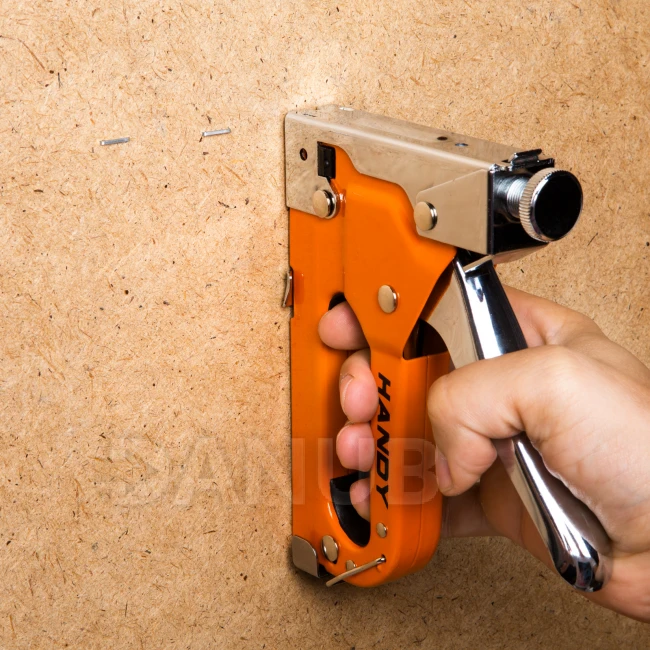 Odolná ručná zošívačka vyrobená z kovu, ktorá je vhodná na zošívanie textilu, dreva, papieru a fólie.K zošívačke môžete použiť hranaté svorky s rozmerom 4 - 14 mm a klince tvaru "T". Pomocou nastavovacej skrutky na vrchu zošívačky môžete nastaviť silu úderu, v závisloti od toho aký materiál chcete zošiť. Ideálna na použitie v domácnosti alebo kancelárii.