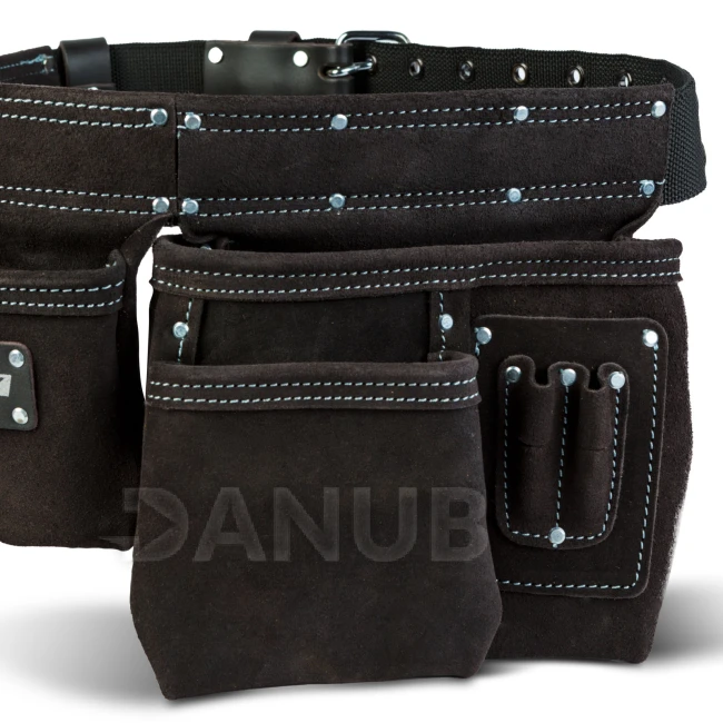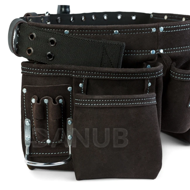 Profesionálny kožený opasok na náradie – 7 vreciek, 1 držiak na kladivo, 4 držiaky na ceruzky