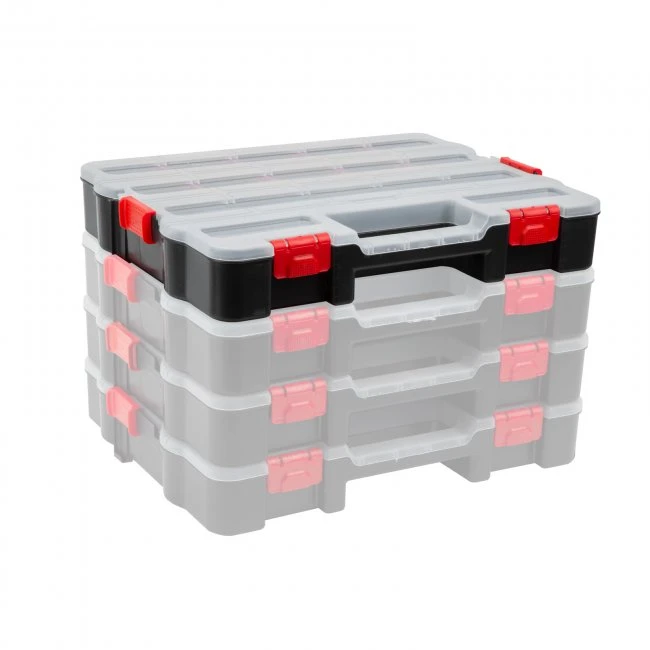 Inovatívne organizéry, ktoré sa dajú navzájom spájať v ľubovoľnom poradí, takže sa dajú ľahko prenášať súčasne.Oraganizéry je možné odomknúť pomocou západky na boku, aby bol potrebný pomocný materiál rýchlo prístupný.Vďaka priehľadnému vrchnáku vidíte obsah a dokonca nájdete potrebnú tašku aj bez toho aby ste ju otvorili.Usporiadajte rôzne veľkosti a typy skrutiek, hmoždiniek, podložiek, matíc, montážnych pomôcok do samostatných vreciek pre rýchlu a efektívnu prácu!Organizéry sú vyrobené z odolného pevného plastu, takže majú dlhú životnosť.Praktické, pretože pomocou pohyblivých prepážok možno vytvoriť až 17 odkladacích priečinkov.Ak nepoužívate voliteľné oddeľovače, k dispozícii sú aj 2 veľké odkladacie priehradky, do ktorých môžete vložiť aj skrutkovač, kľúč alebo iné náradie.