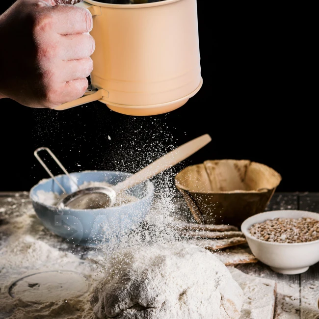 Pomocou tohto praktického sitka múky ľahko a efektívne preosejete múku, práškový cukor alebo iné práškové suroviny na pečenie a varenie. Dizajn sita je moderný a funkčný, umožňuje presné dávkovanie a dosiahnutie hladkých výsledkov bez hrudiek.