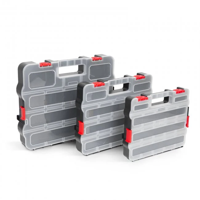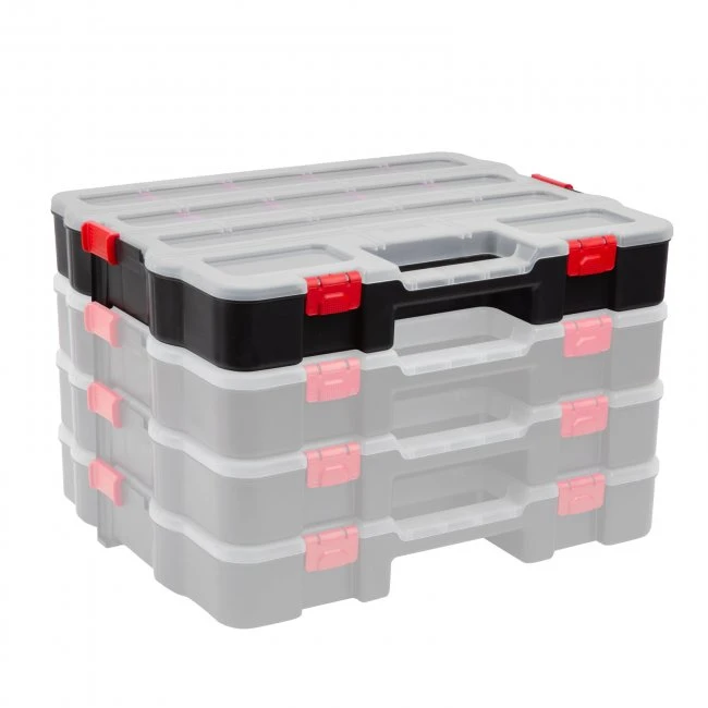 Inovatívne organizéry, ktoré sa dajú navzájom spájať v ľubovoľnom poradí, takže sa dajú ľahko prenášať súčasne.Oraganizéry je možné odomknúť pomocou západky na boku, aby bol potrebný pomocný materiál rýchlo prístupný.Vďaka priehľadnému vrchnáku vidíte obsah a dokonca nájdete potrebnú tašku aj bez toho aby ste ju otvorili.Usporiadajte rôzne veľkosti a typy skrutiek, hmoždiniek, podložiek, matíc, montážnych pomôcok do samostatných vreciek pre rýchlu a efektívnu prácu!Organizéry sú vyrobené z odolného pevného plastu, takže majú dlhú životnosť.Praktické, pretože pomocou pohyblivých prepážok možno vytvoriť až 17 odkladacích priečinkov.Ak nepoužívate voliteľné oddeľovače, k dispozícii sú aj 2 veľké odkladacie priehradky, do ktorých môžete vložiť aj skrutkovač, kľúč alebo iné náradie.