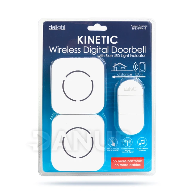 Digitálny bezbatériový a bezdrôtový zvonček – Kinetický – 2 vnútorné jednotky – biely – modrá LED