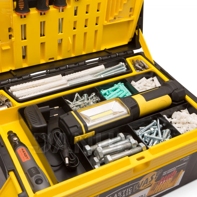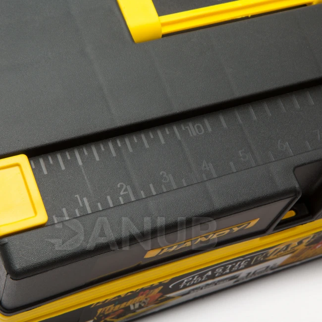 Je ľahko prenosný vďaka svojmu malému rozmeru, napriek tomu disponuje s veľkým úložným priestorom. Na vrchu vstavané pravítko umožnuje presné meranie aj v núdzových prípadoch. Keď je tento plastový kufrík otvorený, je k dispozícii úložný priestor na vrchu, kde je možné uložiť vrtáky a skrutkovače. Ľahko sa používa, aby ste nemuseli otvoriť celý kufrík pre vybranie správneho náradia . V hornej časti kufríka je vyťahovacia zásuvka so 6 menšími a 1 veľkým úložným priestorom. Vyťahovacia zásuvka je vhodná pre ukladanie hmoždiniek a skrutiek.