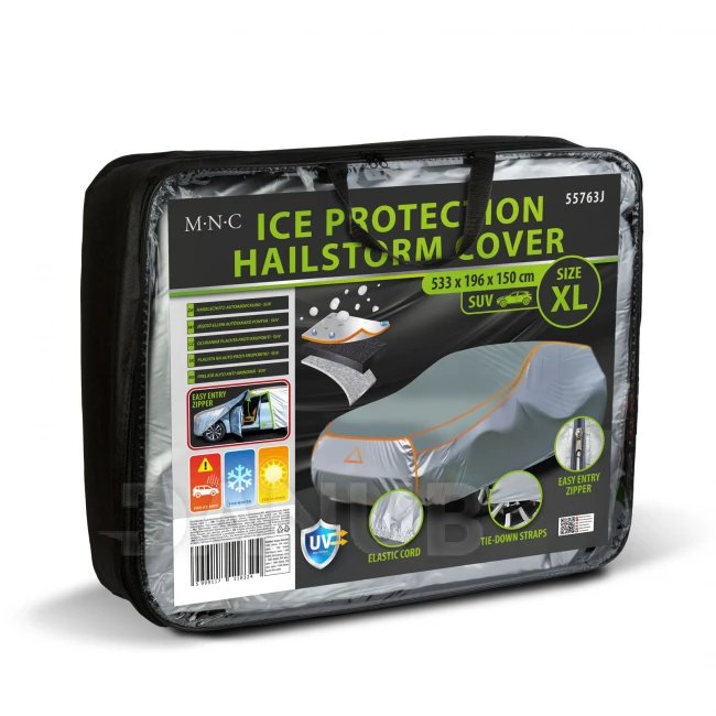 Chráňte svoje auto pred nepriaznivým počasím s touto vysokokvalitnou plachtou proti krupobitiu! Plachta poskytuje úplnú ochranu pred krupobitím, UV žiarením, dažďom a prachom, čím dlhodobo chráni karosériu a lak vášho vozidla. Kryt je vyrobený z tkaniny Oxford 150D a 4 mm hrubej vrstvy EVA peny, ktorá účinne tlmí nárazy spôsobené ľadom a vetvami stromov a zároveň zabezpečuje správne vetranie. Použitím je možné predísť poškodeniu a znečisteniu karosérie. Vstavané trojuholníkové reflexné logo zlepšuje viditeľnosť a dva upevňovacie popruhy zaisťujú, že plachta zostane stabilne na svojom mieste aj pri silnom vetre. Pomocou bočného zipsu sa môžete ľahko dostať do vozidla bez odstránenia plachty.