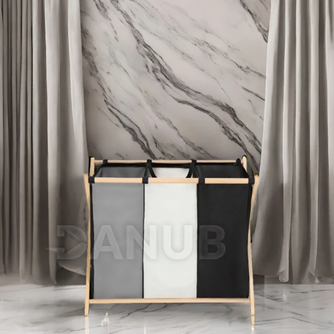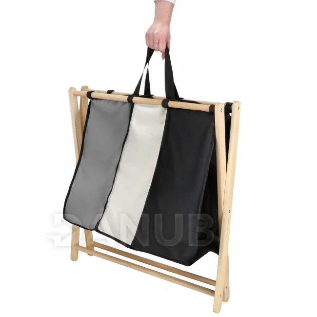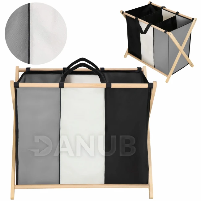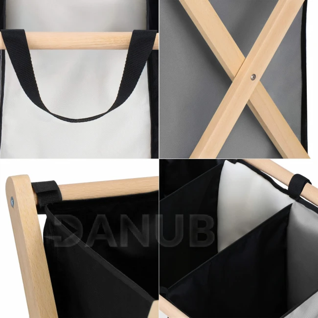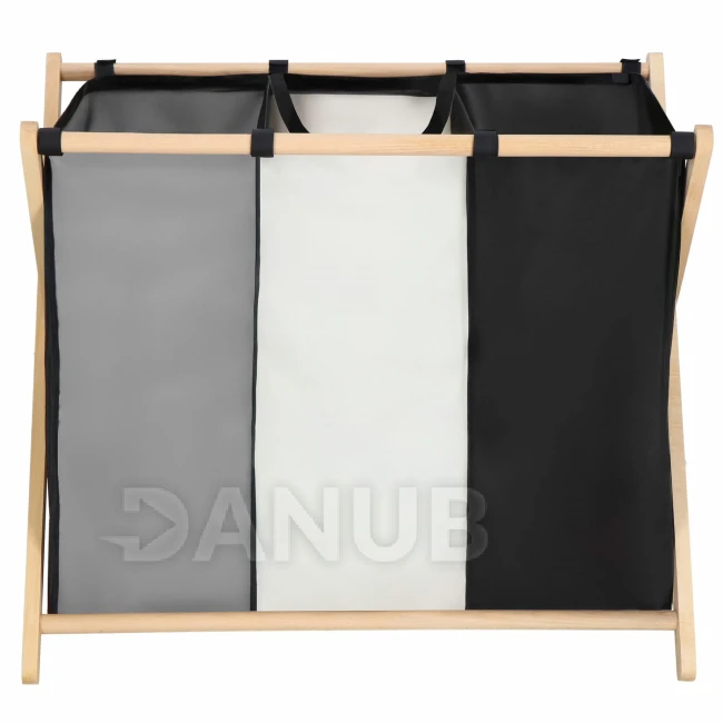 - Voľne stojaci, otvorený kôš na bielizeň; drevený rám + látkové priehradky