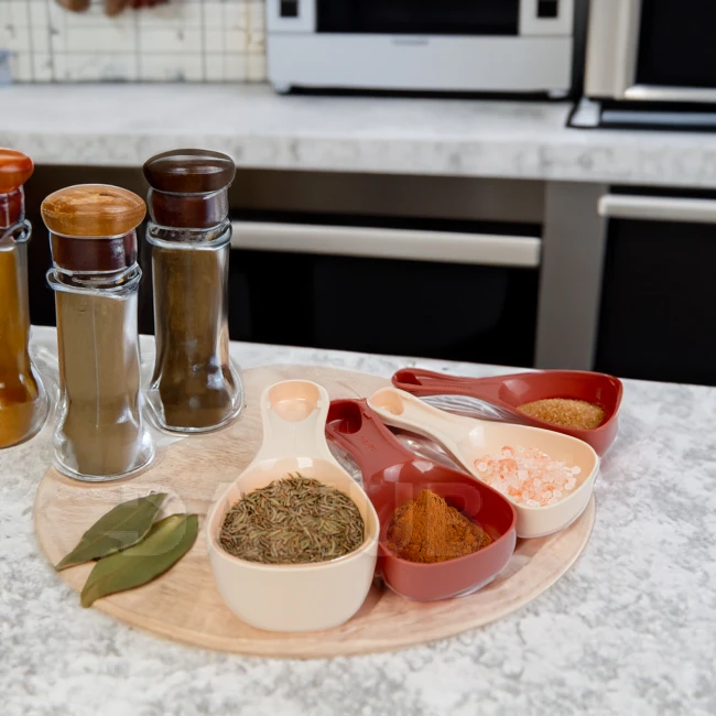 Množstvá surovín popísané v receptoch môžu byť dodržané iba presnými meraniami. Táto sada odmerných lyžičiek nám pomôže odmerať tekuté ingrediencie.
