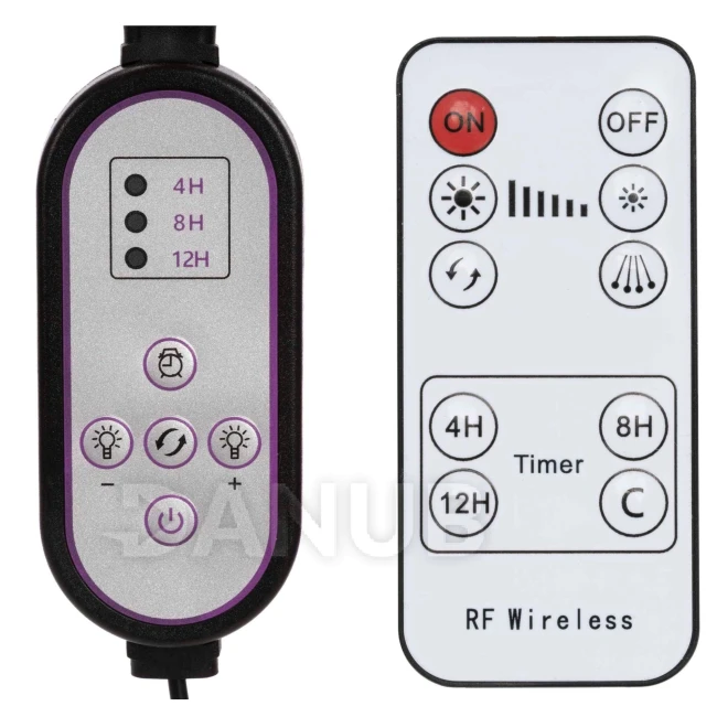 - Lampa má dva diaľkové ovládače: jeden zabudovaný v kábli s funkciami ZAP/VYP, časovačom, nastavením jasu a zmenou farby; a jeden diaľkový ovládač umožňujúci ZAP/VYP, nastavenie jasu, zmenu farby, výber svetelných panelov a časovač.