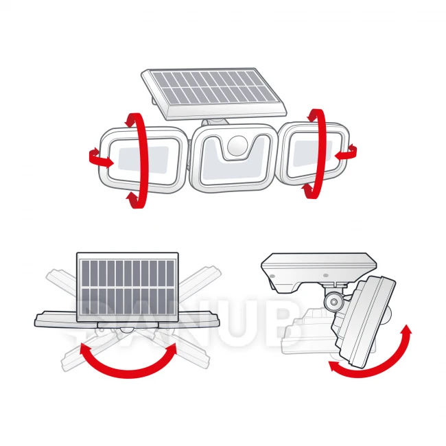 Vysokovýkonný nástenný reflektor s pohybovým senzorom, ktorý pozostáva z troch otáčateľných COB LED a 1 ks veľkého solárneho panelu.LED diódy, ktoré sa dajú otáčať pozdĺž dvoch osí, sú ľubovoľne nastaviteľné, takže zaručene osvetlia potrebnú oblasť za každých podmienok. Môže byť ideálny na osvetlenie terás, vchodov, prístreškov na auto.Vďaka solárnemu vyhotoveniu nie sú potrebné žiadne rozvody, elektrická sieť, dá sa ľahko namontovať na stenu.V tme a pri slabom osvetlení pohyb automaticky zapne svetelný zdroj COB LED.Svetlo sa automaticky vypne po ~ 20 sekundách.Počas dňa sa zabudovaný akumulátor dobíja vďaka solárnemu článku.