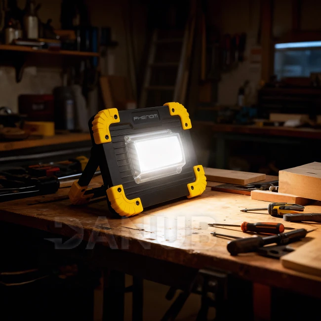 Nový kvalitný reflektor zo série Phenom je nepostrádateľným pomocníkom pre dielne, stavby, ale aj do domácnosti. Výkonná 16 W COB LED lampa so svetelným tokom približne 1000 lúmenov dokáže osvetliť priestor až na 6 hodín. Vstavaný 5V micro-USB port umožňuje napájanie napríklad pre nabíjanie mobilného telefónu.