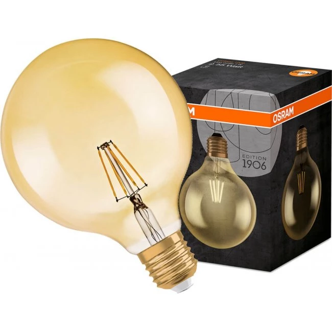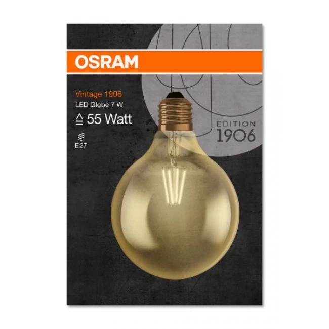 Dekoratívna LED žiarovka značky OSRAM VINTAGE 1906 GLOBE, ktorá je na trhu uznávaná, je svetelným zdrojom zabudovaným do priehľadnej sklenenej žiarovky v zlatej farbe, ktorá sa vyznačuje predovšetkým energetickou účinnosťou, ktorá umožňuje použitie inovatívnej technológie LED vlákien. OSRAM Vintage 1906 GLOBE so základňou 7 W E27 (ekvivalent klasickej 55W žiarovky) vyžaruje teplé svetlo vo farbe 2 500 K, zatiaľ čo svetelný tok je 470 lm. Štýl a vzhľad dekoratívnej žiarovky VINTAGE sa dokonale hodí do každého interiéru a osvetlí ich príjemným svetlom. Osram Vintage 1906 GLOBE sú žiarovky, ktoré najlepšie zodpovedajú svietidlám v minimalistickom alebo modernom štýle. Žiarovka LED Osram Vintege 1906 LED sa dá namontovať do všetkých tradičných svietidiel s päticou E27, čo veľmi uľahčuje výmenu starej žiarovky za tento model.| Príkon [Wat] | 7 |