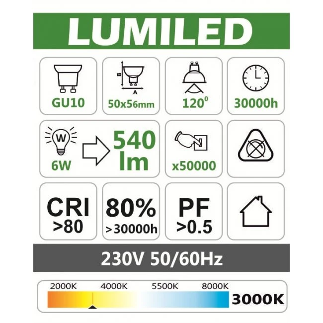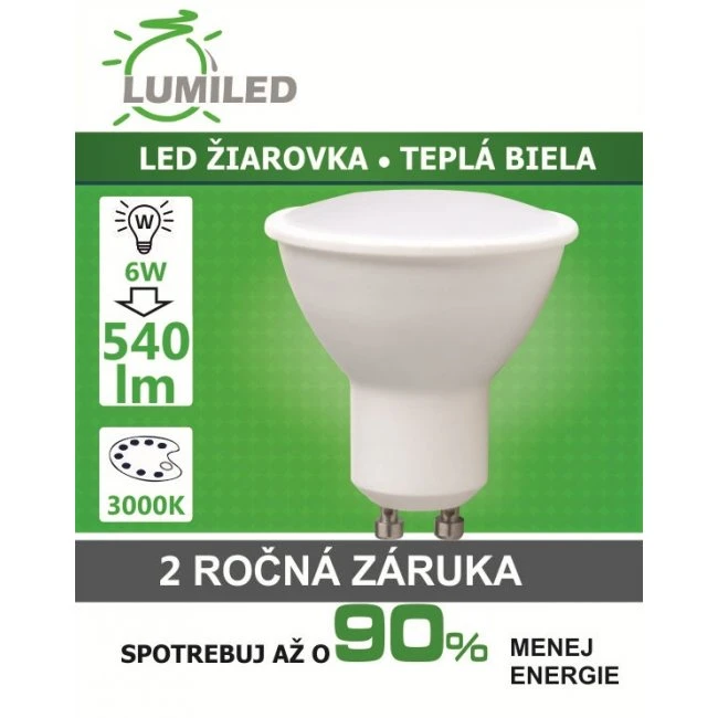 Typ LED SMD 2835 Objímka GU10 Príkon 6 W Napájanie 230V AC Farba svetla Teplá biela Teplota farby svetla 3000K (Teplá biela) Svetelný tok, lumeny 540lm Rozmer 50 x 56 mm Uhol svietenia 120° Životnosť min 30 000 hodín Certifikáty CE, RoHS Index podania farieb (CRI) Ra > 80 - Energetická trieda A+