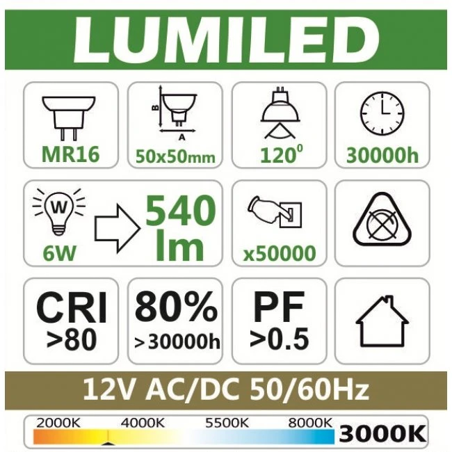 Typ LED SMD 2835 Objímka MR 16 Príkon 6 W Napájanie 12V AC/DC Farba svetla Teplá biela Teplota farby svetla 3000K (Teplá biela) Svetelný tok, lumeny 540lm Rozmer 50 x 50 mm Uhol svietenia 120° Životnosť min 30 000 hodín Certifikáty CE, RoHS Index podania farieb (CRI) Ra > 80 - Energetická trieda A+