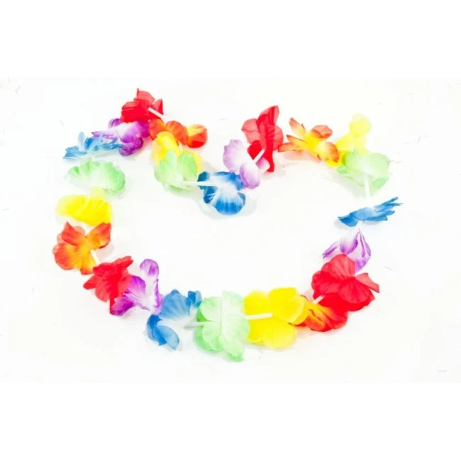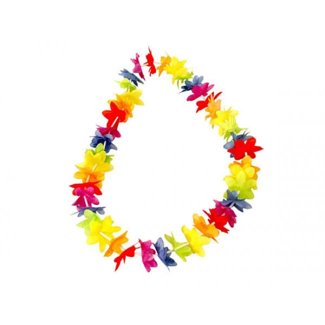 Náhrdelník s umelými farbenými kvetmi pripomína exotiku s tropickou klimou. Náhrdelník je taktiž skvelý na nejaké letné záhradne party s exotickou tematikou. Jeho dĺžka je približne 90cm a nachádza sa na ňom cca 24ks kvetou.