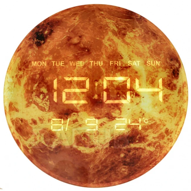 Funkčnosť a štýl sú hlavné črty týchto hodín s grafikou planéty Mars! Intuitívny displej zobrazuje presný čas (12/24h), dátum (M/D/Y), deň v týždni (v angličtine) a aktuálnu teplotu. Po nastavení dátumu a času bude deň v týždni nepretržite blikať. Vďaka možnosti zavesiť ho na stenu alebo umiestniť na priložený stojan sa hodí do každého interiéru. Napájanie z elektrickej siete, s prídavnou batériou CR2032 (súčasť balenia) na ochranu nastavení, zaručuje spoľahlivú prevádzku.