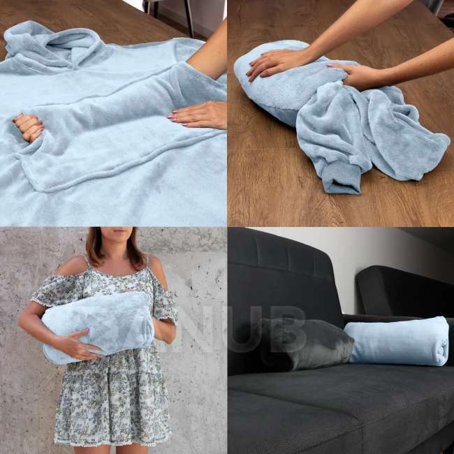 Ľahko sa zmení na vankúš. Mikinová deka sa dá použiť ako župan. Ideálna na všetky ročné obdobia (najmä na jeseň a zimu). Výrobok na doma aj do exteriéru.