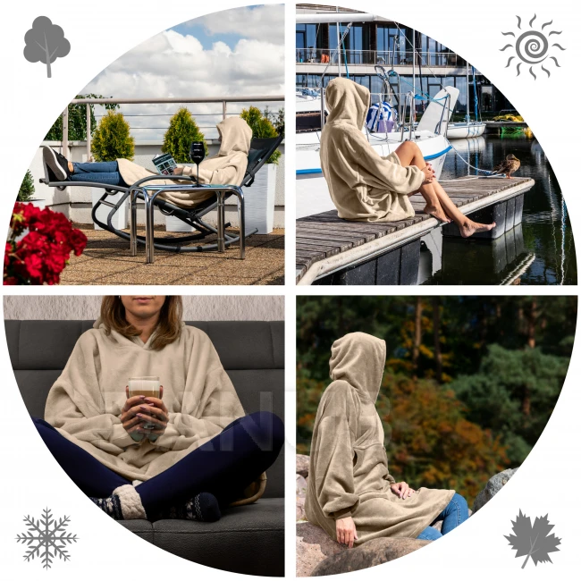 Ľahko sa zmení na vankúš. Mikinová deka sa dá použiť ako župan. Ideálna na všetky ročné obdobia (najmä na jeseň a zimu). Výrobok na doma aj do exteriéru.