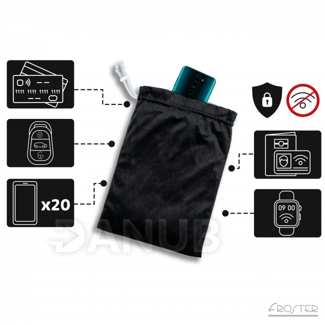 Po vložení zariadenia do tašky sa signál na zariadení stratí. Po vybratí zariadenia z tašky sa príjem signálu okamžite obnoví. Je dostatočne veľká na uloženie niekoľkých zariadení, takže ju môžete použiť na večierku alebo pri trávení času s rodinou.