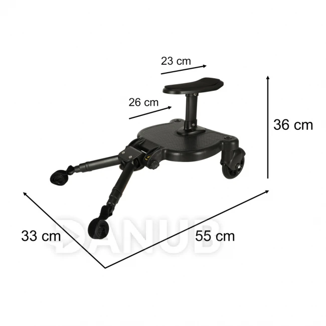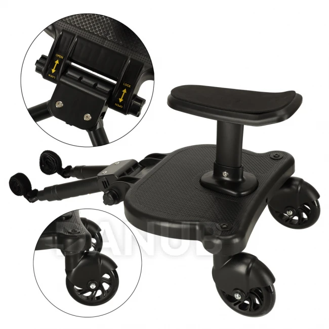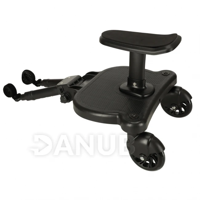 Predĺženie kočíka so sedačkou je praktická ponuka pre rodičov, ktorí potrebujú miesto pre svojho „staršieho“ pri prechádzke s batoľaťom v kočíku. Univerzálny montážny systém umožňuje pripevniť nadstavec na kočíky od rôznych výrobcov. Maximálne zaťaženie je 25 kilogramov. Súprava obsahuje montážny popruh , ktorý vám umožní zavesiť stojan na kočík, keď sa chvíľu nepoužíva.