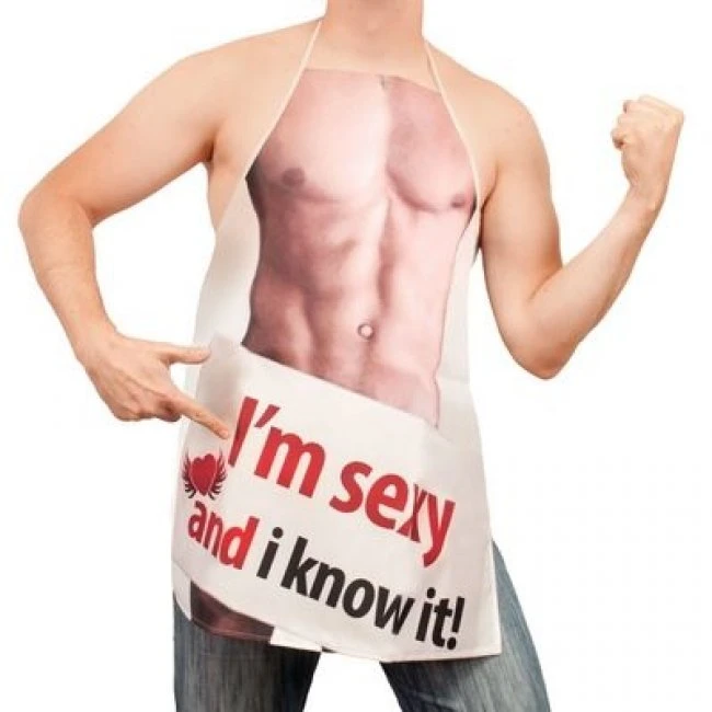 Kuchynská zástera s potlačou mužského tela a nápisom.