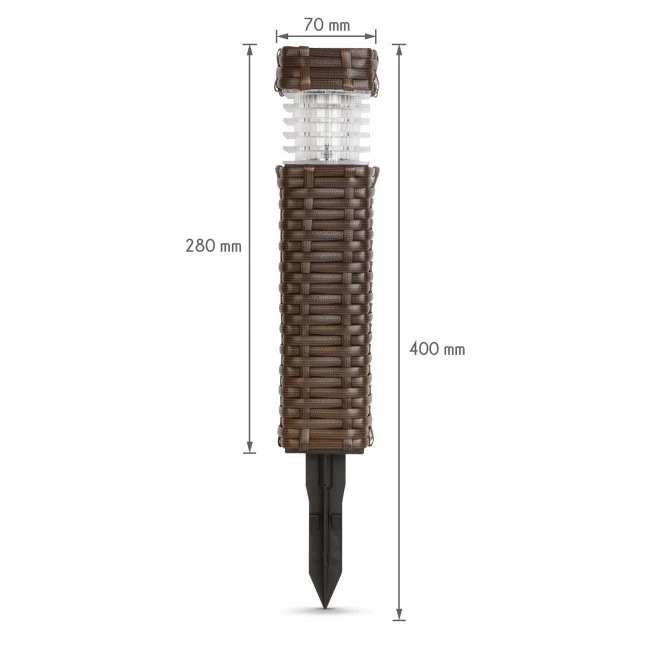 Urobte svoju záhradu výnimočnou s touto LED solárnou lampou.Môžete ju použiť ako smerové svetlo alebo ako dekoráciu. Pomocou zapichovacieho tŕňa ju môžete jednoducho a rýchlo umiestniť.Po zotmení sa svetlá automaticky zapnú a po východe slnka vypnú.Počas dňa solárne články premenia slnečné lúče na energiu a uložia do akumulátoru.Hnedá farba a ratanový efekt dodávajú lampe moderný vzhľad, hrubá bočná stena je odolná. Produkt tiež dokonale harmonizuje s našimi produktmi 11535, 11482A. .