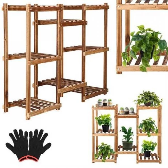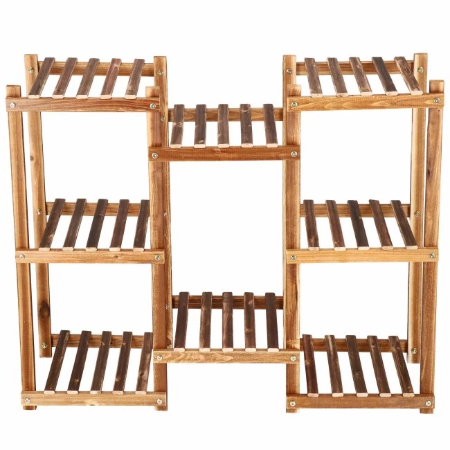 Drevený stojan na kvety s 8 policami - 70cm - tmavá hnedá/antický efekt