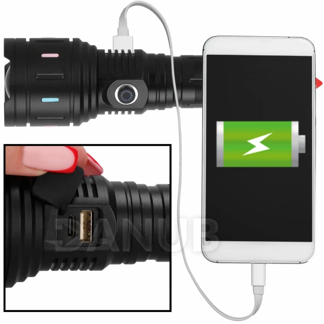 - Na svietiacej časti baterky je USB zásuvka s 2 vstupmi - USB a Type C vstup