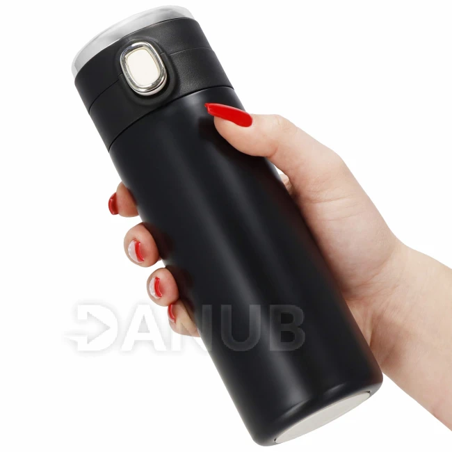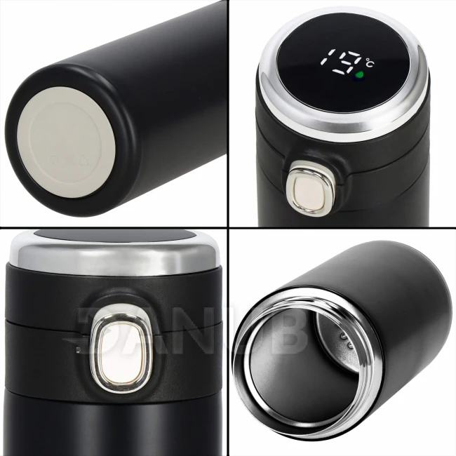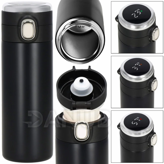 - Elektronický displej teploty na vrchu uzáveru, v stupňoch Celzia, farba kvapôčky na displeji indikuje stupeň tepla nápoja: zelená, oranžová, červená