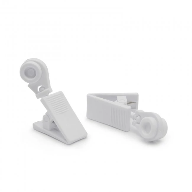 Biely plastový ozdobný štipec na záclony. S bežcom.Biele štipce vytvárajú harmóniu s bielymi závesmi.Vyhotovenie s bežcom.
