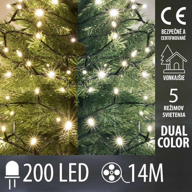 Vianočná led svetelná reťaz vonkajšia DUAL COLOR - 2v1 - programy - 200led - 14m - teplá biela/studená biela