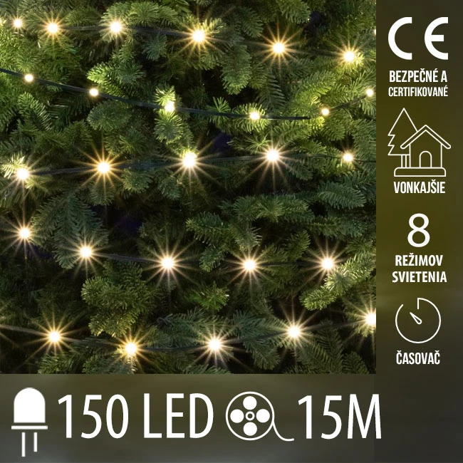 Vianočná led svetelná reťaz vonkajšia - DOT LED - 150 led - 15m - programy, časovač - teplá biela