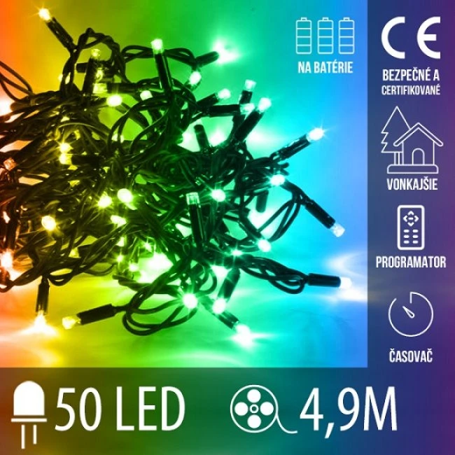 Vianočná LED svetelná reťaz vonkajšia na batérie s časovačom + programator - 50LED - 4,90M Multicolour