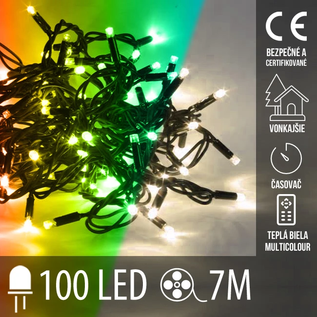 Vianočná led svetelná reťaz vonkajšia s časovačom + 2 farebné variácie - 100led - 7m teplá biela/multicolour