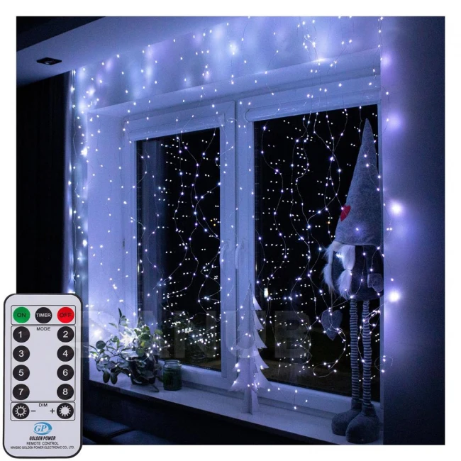 Vianočná led svetelná záclona na batérie vonkajšia - 300 led - programy - ovládač - 3x3m - studená biela