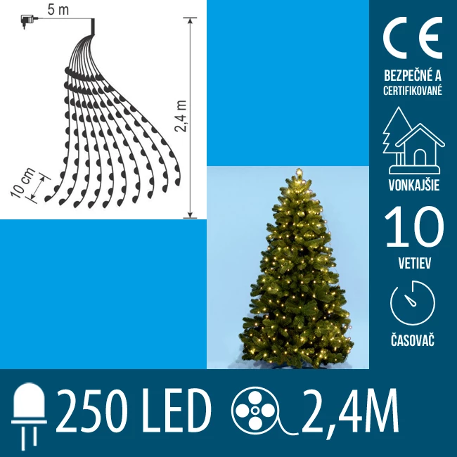 Vianočný LED zväzok svietiacich reťazcov s časovačom - 10 reťazcov po 25ks LED - 2,4m - Teplá biela