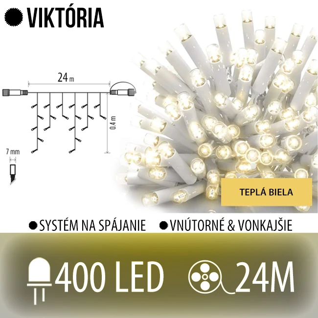 VIKTÓRIA spojovateľná LED svetelná záclona vonkajšia - 400LED - 24M Teplá biela - biely kábel