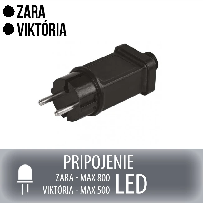 Napájací adaptér s možnosťou spájania Connecting system Vám umožní spájať Vianočné osvetlenie zo systému VIKTÓRIA (maximálne 500 Led), a spájať vianočné osvetlenie zo systému ZARA(maximálne 800 Led).